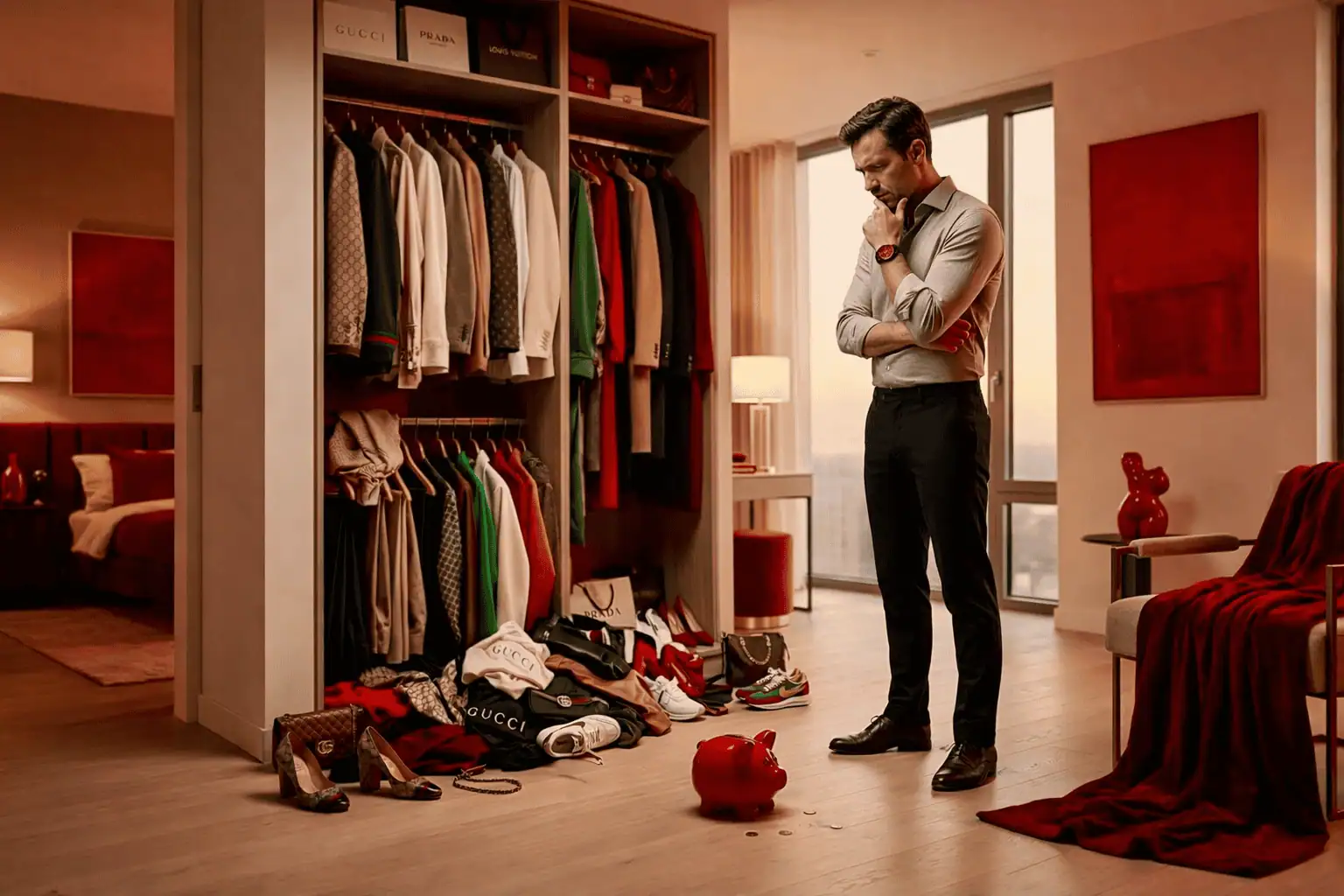 Muž stojí před přeplněnou skříní plnou značkového oblečení a dívá se na prázdné prasátko na zemi - genrováno AI
