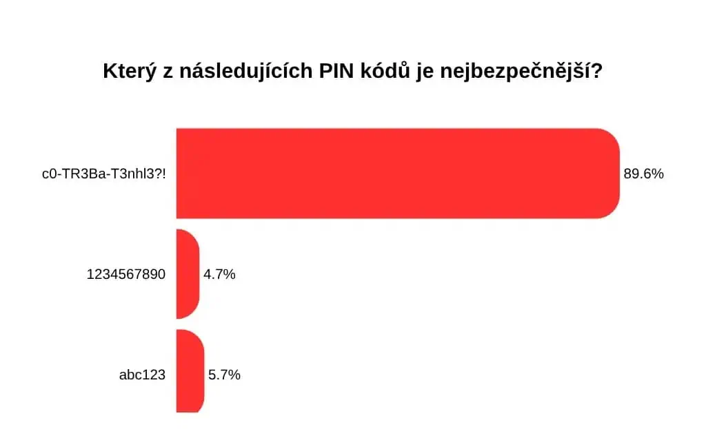 Na druhém místě našeho kvízu přistála otázka na PINy a hesla. A víte co? 90 % se nenechalo oblafnout a správně ukázalo prstem na tu nejlepší volbu - kombinaci písmen, čísel a speciálních znaků. To je, jako byste místo papírových dveří do bytu měli trezorovou ocel s pěti zámky a laserovou mříží. Bravo!