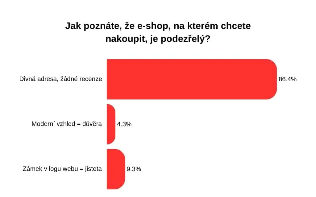 Na internetu může mít každý svůj obchod. A to znamená i podvodníci. V našem kvízu jsme se ptali, jak poznat podezřelý e-shop. A 86,4 % lidí správně ukázalo na divné adresy a chybějící recenze. To je výborný instinkt!