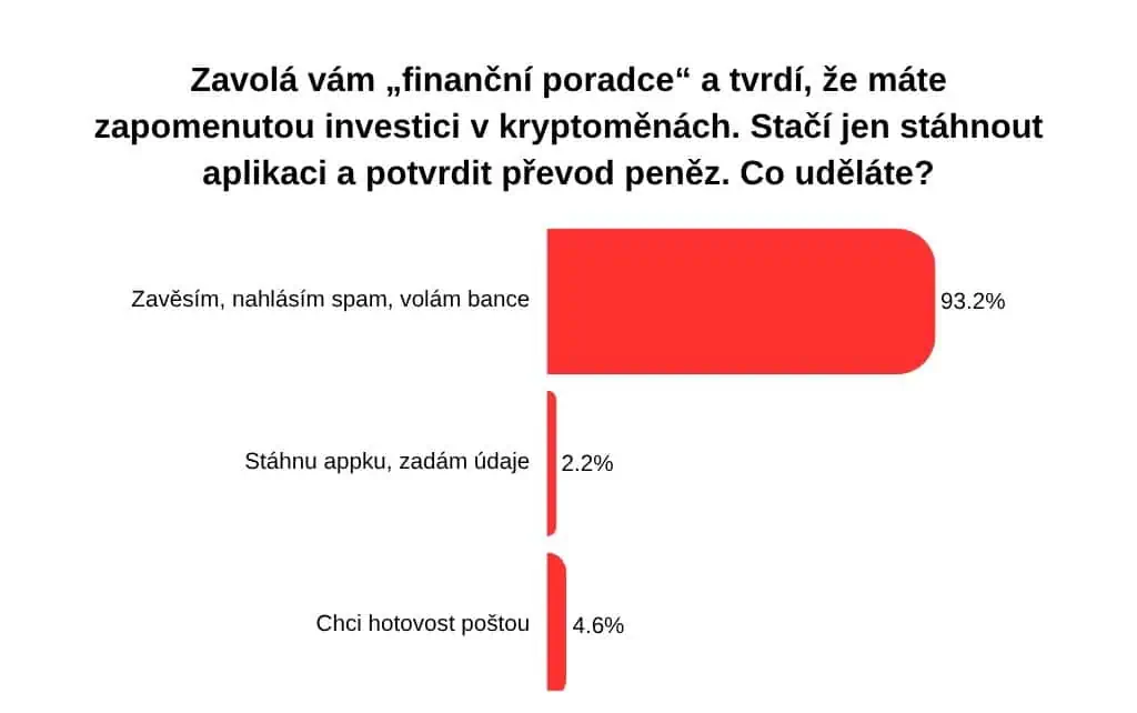 A nakonec tu máme klasiku posledních let - falešné finanční poradce (podvod takzvaný vishing). Zavolají, tváří se důvěryhodně a slibují, že na vás čekají miliony v kryptoměnách v zapomenuté peněžence. Stačí jen stáhnout aplikaci a potvrdit převod. Co na to výsledky? 93,2 % se nedalo nachytat a hovor by hned zavěsilo.