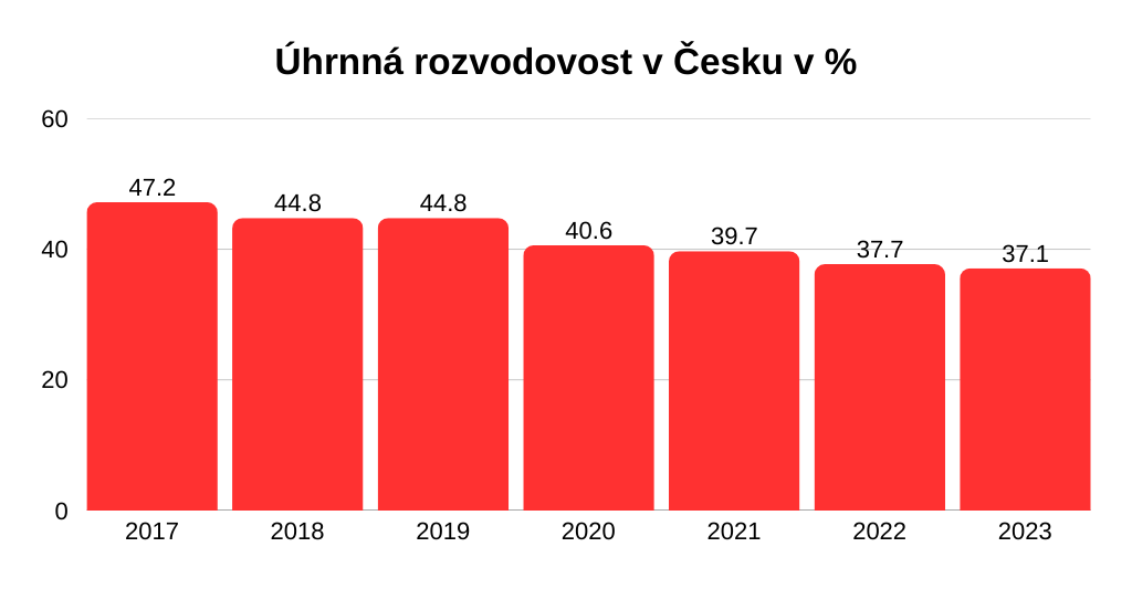 Úhrnná rozvodovost v Česku od poloviny 50. let postupně rostla a svého vrcholu dosáhla kolem roku 2010. Tehdy to statisticky vycházelo tak, že by se rozvedlo každé druhé manželství.