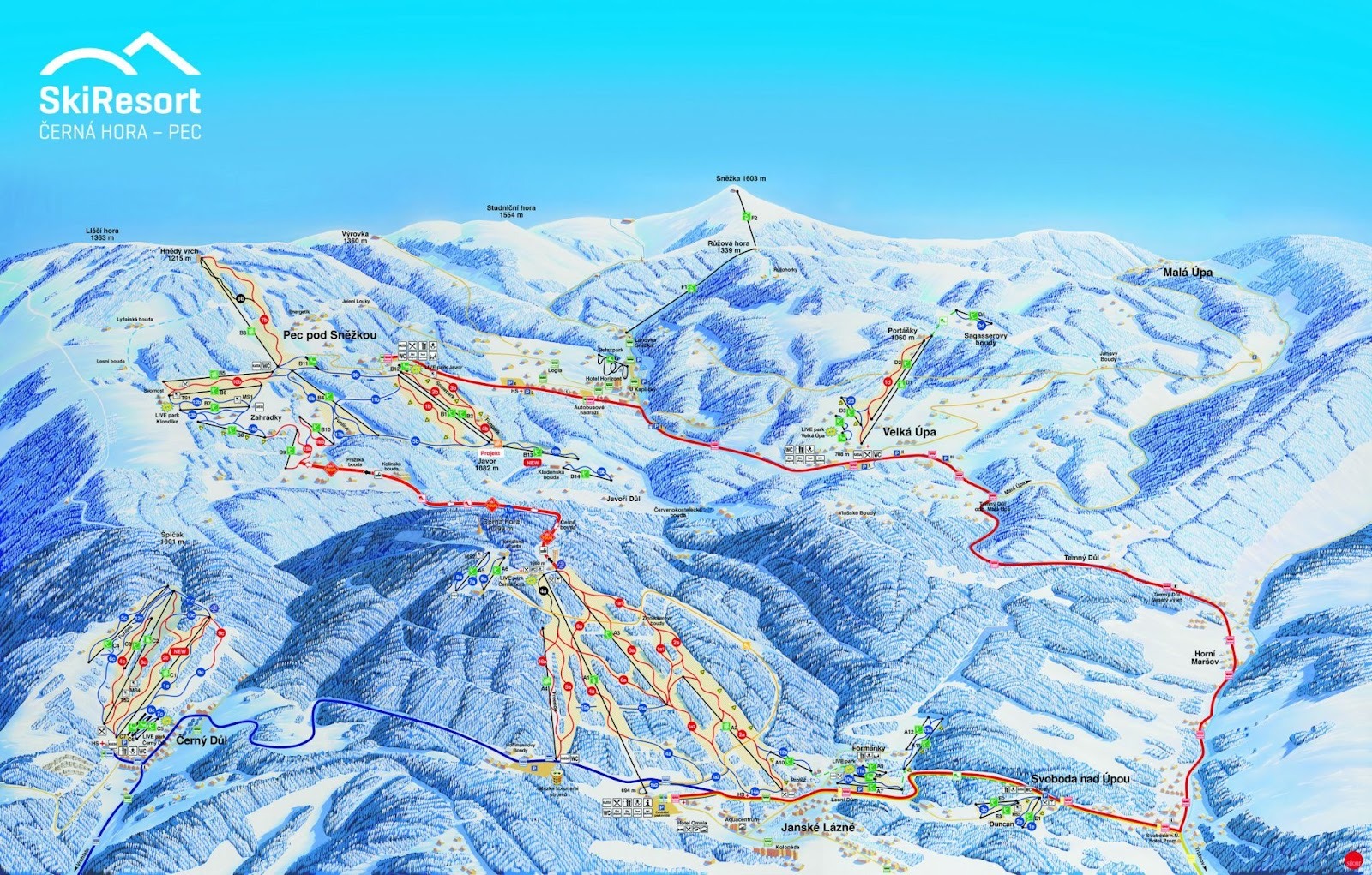 Každý z propojených areálů má svůj styl - Pec pro výzvy, Černý Důl pro pohodu, Velká Úpa pro výletníky a Malá Úpa… no, pro ty, co ocení útulno. Jsou tu tříkilometrové sjezdovky, kde si kolena řeknou o pauzu dřív než vy, ale taky Funline tratě s klopenými zatáčkami, tunely a slalomem s časomírou, takže si můžete zalyžovat i s egem. Děti tu mají svoje malé sněhové ráje, kde se nemusí bát, že je přejede strejda Franta v závodním režimu.